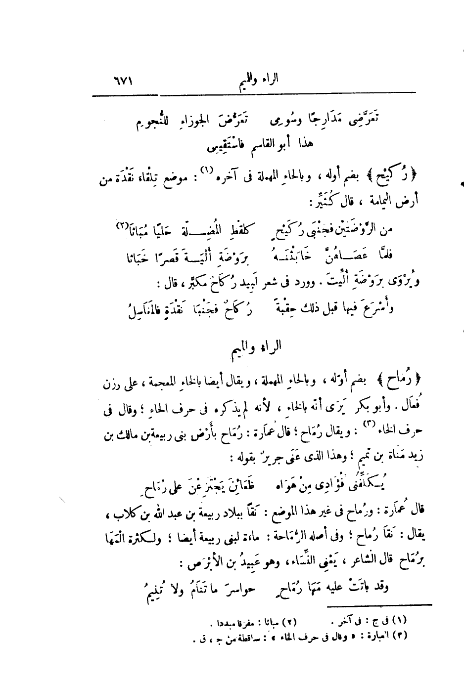 قال عمارة: ورماح فى غير هذا الموضع: نقا ببلاد ربيعة بن عبد الله بن كلاب، يقال: نقا رماح؛ وفى أصله الرّماحة: ماءة لبنى ربيعة أيضا؛ ولكثرة المها برماح قال الشاعر، يعنى النّساء، وهو عبيد بن الأبرص: