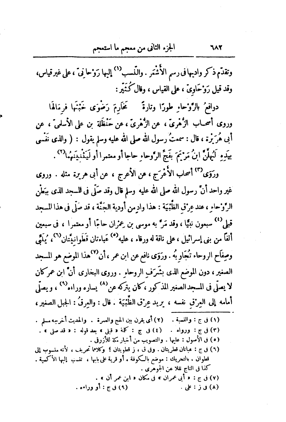 وروى «3» أصحاب الأعرج، عن الأعرج، عن أبى هريرة مثله. وروى غير واحد أنّ رسول الله صلى الله عليه وسلم قال وقد صلّى فى المسجد الذي ببطن الرّوحاء، عند عرق الظّبية: هذا واد من أودية الجنّة، قد صلّى فى هذا المسجد قبلى «4» سبعون نبيّا، وقد مرّ به موسى بن عمران حاجّا أو معتمرا، فى سبعين ألفا من بنى إسرائيل، على ناقة له ورقاء، عليه «5» عباءتان قطوانيّتان «6» ، يلبّى وصفاح الروحاء تجاوبه. وروى نافع عن ابن عمر، أن «7» هذا الموضع هو المسجد الصغير، دون الموضع الذي بشرف الروحاء. وروى البخارى أنّ ابن عمر كان لا يصلّى فى المسجد الصغير المذكور، كان يتركه عن «8» يساره وراءه «9» ، ويصلّى أمامه إلى العرق نفسه، يريد عرق الظّبية. قال: والعرق: الجبل الصغير،