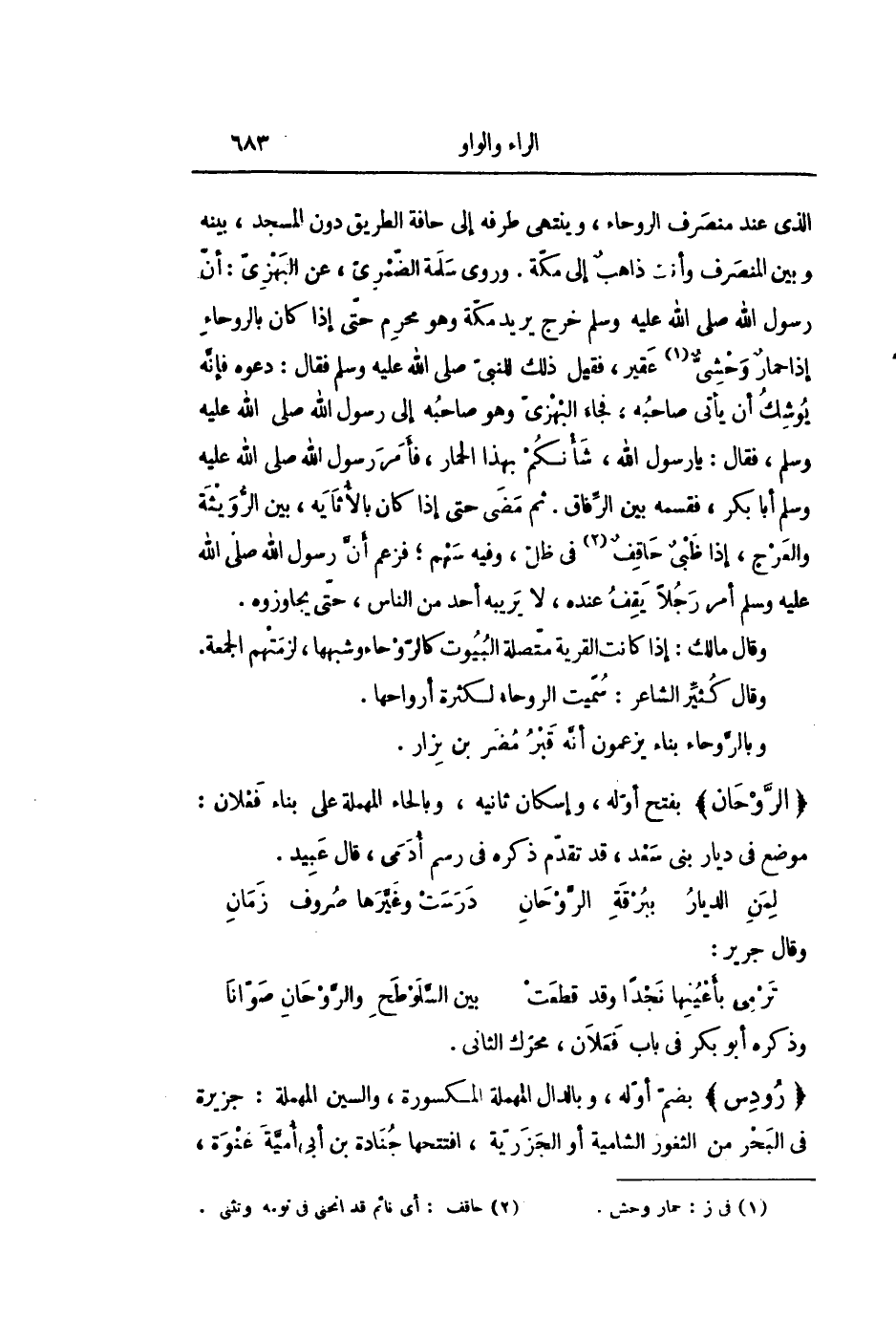 الذي عند منصرف الروحاء، وينتهى طرفه إلى حافة الطريق دون المسجد، بينه وبين المنصرف وأنت ذاهب إلى مكّة. وروى سلمة الضّمرىّ، عن البهزىّ: أنّ رسول الله صلى الله عليه وسلم خرج يريد مكّة وهو محرم حتّى إذا كان بالروحاء إذا حمار وحشىّ «1» عقير، فقيل ذلك للنبىّ صلى الله عليه وسلم فقال: دعوه فإنّه يوشك أن يأتى صاحبه، فجاء البهزىّ وهو صاحبه إلى رسول الله صلى الله عليه وسلم، فقال: يا رسول الله، شأنكم بهذا الحمار، فأمر رسول الله صلى الله عليه وسلم أبا بكر، فقسمه بين الرّفاق. ثم مضى حتى إذا كان بالأثايه، بين الرّويثة والعرج، إذا ظبى حاقف «2» فى ظلّ، وفيه سهم؛ فزعم أنّ رسول الله صلى الله عليه وسلم أمر رجلا يقف عنده، لا يريبه أحد من الناس، حتّى يجاوزوه.