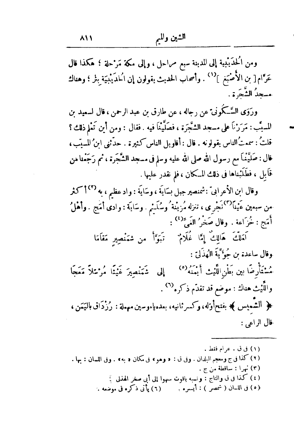 وقال ابن الأعرابىّ: شمنصير جبل بساية، واد عظيم، به «2» أكثر من سبعين عينا «3» تجرى، تنزله مزينة وسليم. وساية: وادى أمج. وأهل أمج: خزاعة. وقال صخر الغىّ «4» :
