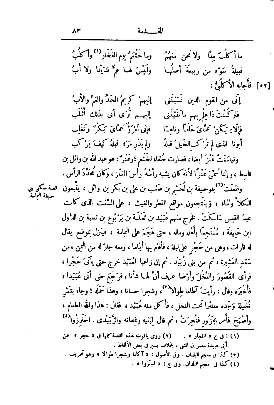 وظعنت «2» بنو حنيفة بن لجيم بن صعب بن على بن بكر بن وائل، يتّبعون الكلأ والماء، وينتجعون مواقع القطر والغيث، على السّمت الذي كانت عبد القيس سلكت. فخرج منهم عبيد بن ثعلبة بن يربوع بن ثعلبة بن الدّول ابن حنيفة، منتجعا بأهله وماله، حتى هجم على اليمامة، فينزل بموضع يقال له قارات، وهى من حجر على ليلة، فأقام بها أيّاما، ومعه جار له من اليمن، من سعد العشيرة، ثم من بنى زبيد. ثم إن راعيا لعبيد خرج حتى يأتى حجرا، فرأى القصور والنّخل وأرضا عرف أنّ لها شأنا، فرجع حتى أتى عبيدا، فأخبره وقال: رأيت آطاما طوالا «3» ، وشجرا حسانا، وهذا حمله؛ وجاء بتمر نخيلة وجده منتثرا تحت النخل، فأكل منه عبيد، فقال: هذا والله الطعام، وأصبح فأمر بجزور فنحرت، ثم قال لبنيه وغلمانه والزّبيدى. احترزوا «4»
