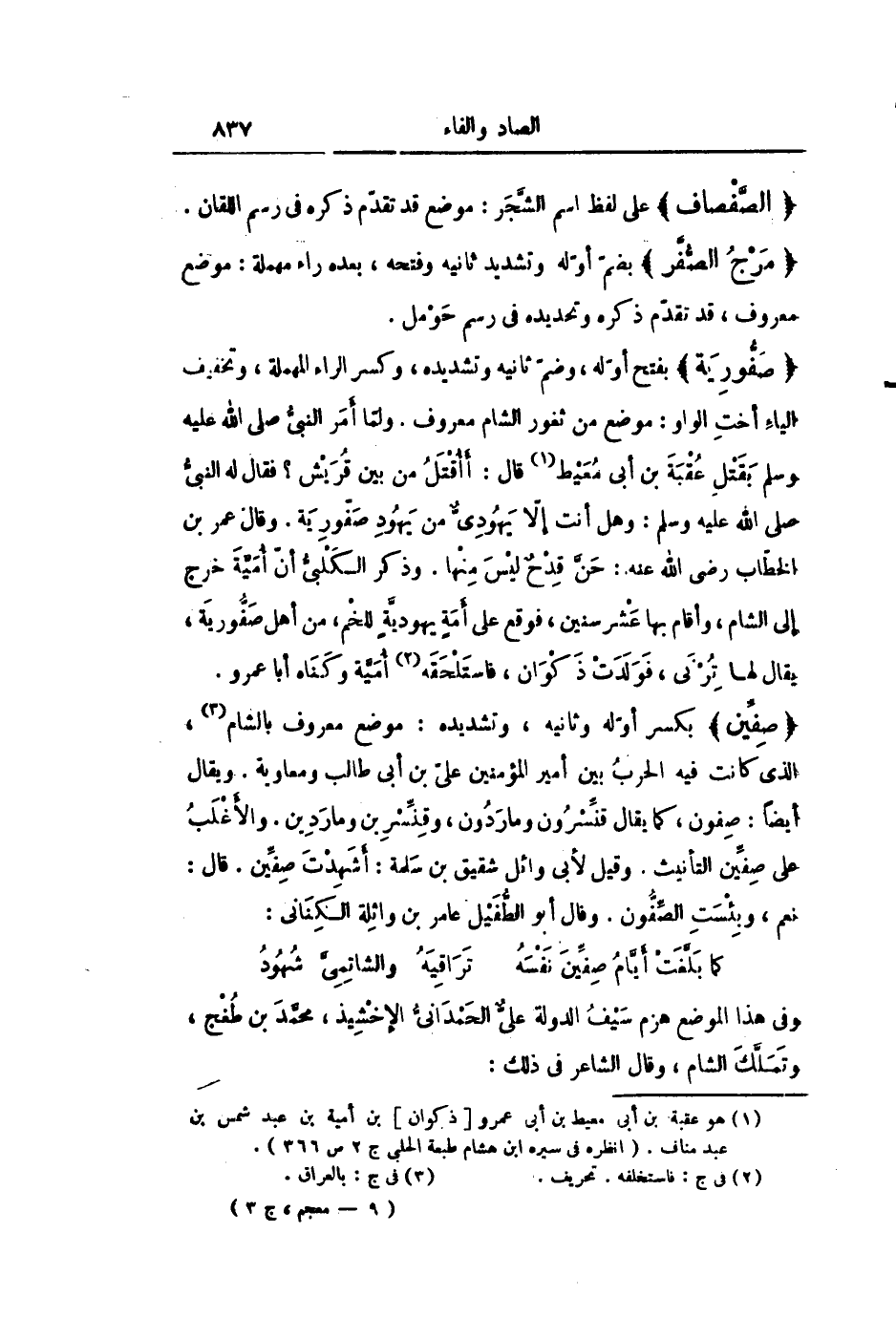 بكسر أوّله وثانيه، وتشديده: موضع معروف بالشام «3» ، الذي كانت فيه الحرب بين أمير المؤمنين علىّ بن أبى طالب ومعاوية. ويقال أيضا: صفون، كما يقال قنّسرون وماردون، وقنّسرين وماردين. والأغلب على صفّين التأنيث. وقيل لأبى وائل شقيق بن سلمة: أشهدت صفّين. قال: