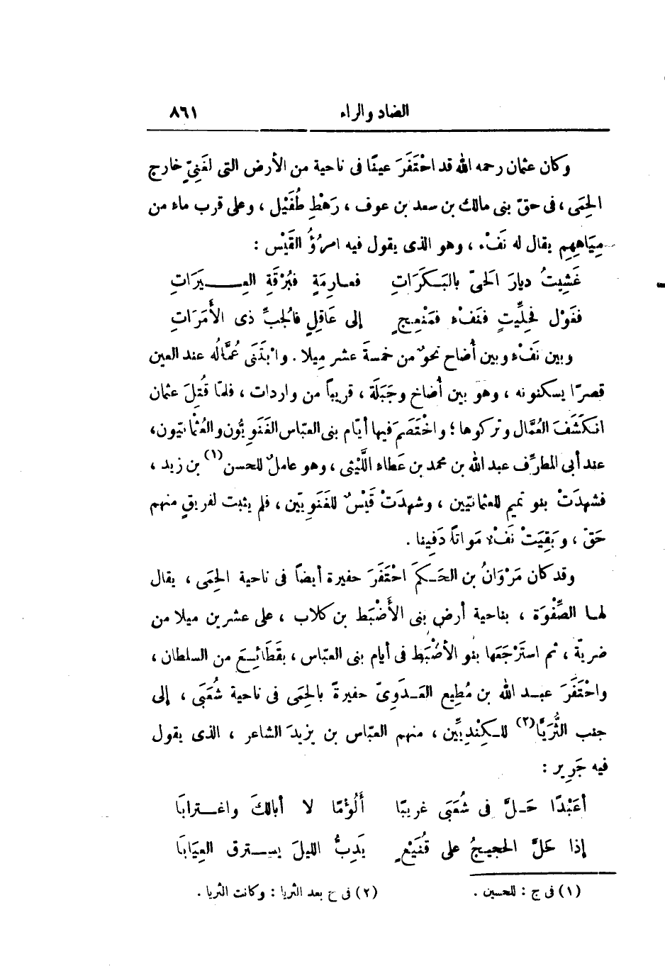 وقد كان مروان بن الحكم احتفر حفيرة أيضا فى ناحية الحمى، يقال لها الصّفوة، بناحية أرض بنى الأضبط بن كلاب، على عشرين ميلا من ضريّة، ثم استرجعها بنو الأضبط فى أيام بنى العبّاس، بقطائع من السلطان، واحتفر عبد الله بن مطيع العدوىّ حفيرة بالحمى فى ناحية شعبى، إلى جنب الثّريّا «2» للكنديّين، منهم العبّاس بن يزيد الشاعر، الذي يقول فيه جرير: