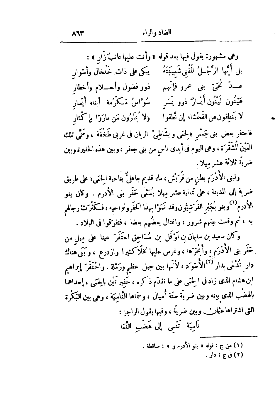 ولبنى الأدرم بطن من قريش، ماء قديم جاهلىّ بناحية الحمى، على طريق ضرية إلى المدينة، على ثمانية عشر ميلا يسمّى حفر بنى الأدرم. وكان ينو الأدرم «1» وبنو بجير القرشيّون وقد نموا بهذا الحفر ونواحيه، فكثرت رجالهم به، ثم وقعت بينهم شرور، واغتال بعضهم بعضا، فتفرّقوا فى البلاد.