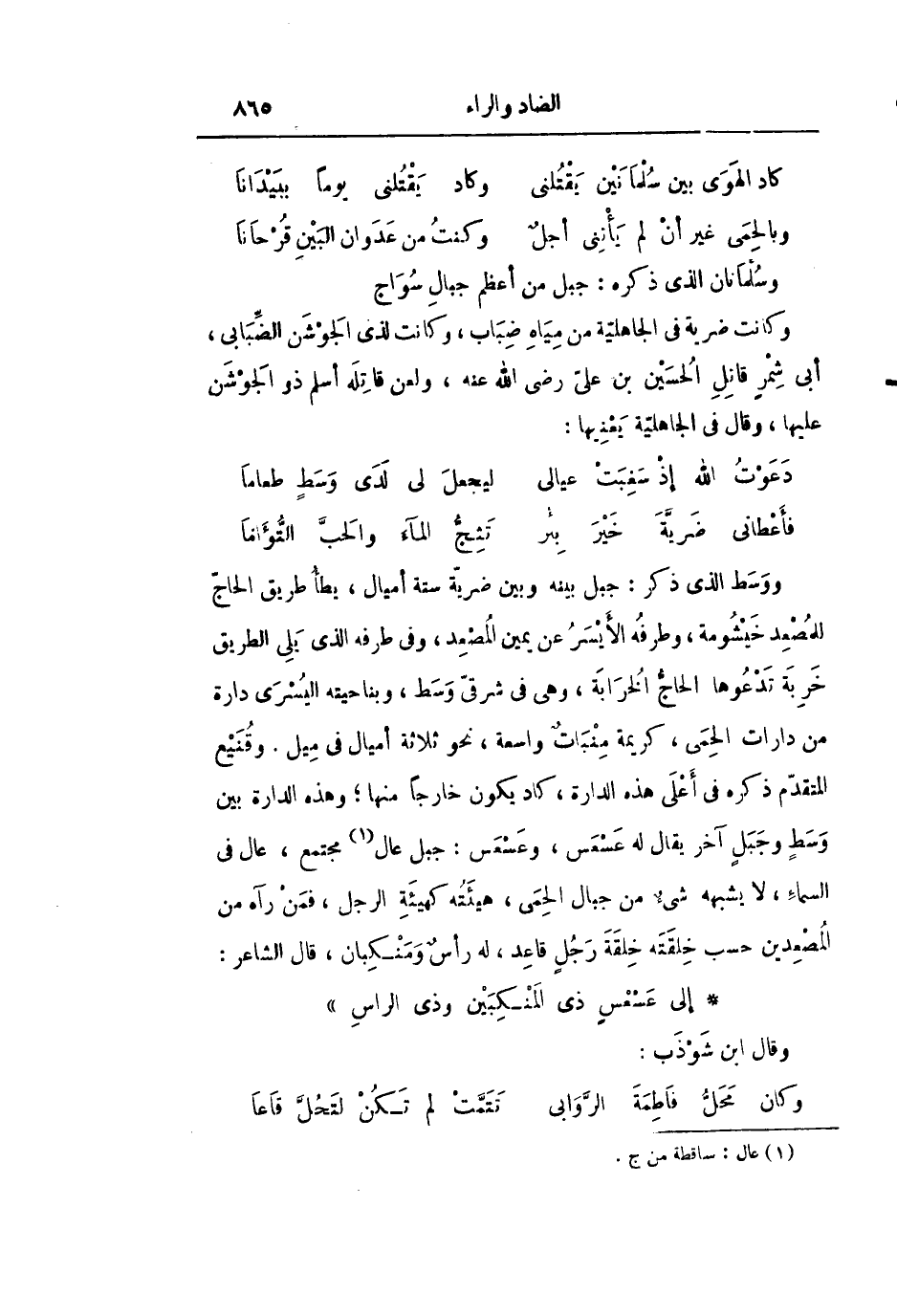 ووسط الذي ذكر: جبل بينه وبين ضريّة ستة أميال، يطأ طريق الحاجّ للمصعد خيشومة، وطرفه الأيسر عن يمين المصعد، وفى طرفه الذي يلى الطريق خربة تدعوها الحاجّ الخرابة، وهى فى شرقىّ وسط، وبناحيته اليسرى دارة من دارات الحمى، كريمة منبات واسعة، نحو ثلاثة أميال فى ميل. وقنيع المتقدّم ذكره فى أعلى هذه الدارة، كاد يكون خارجا منها؛ وهذه الدارة بين وسط وجبل آخر يقال له عسعس، وعسعس: جبل عال «1» مجتمع، عال فى السماء، لا يشبهه شىء من جبال الحمى، هيئته كهيئة الرجل، فمن رآه من المصعدين حسب خلقته خلقة رجل قاعد، له رأس ومنكبان، قال الشاعر: