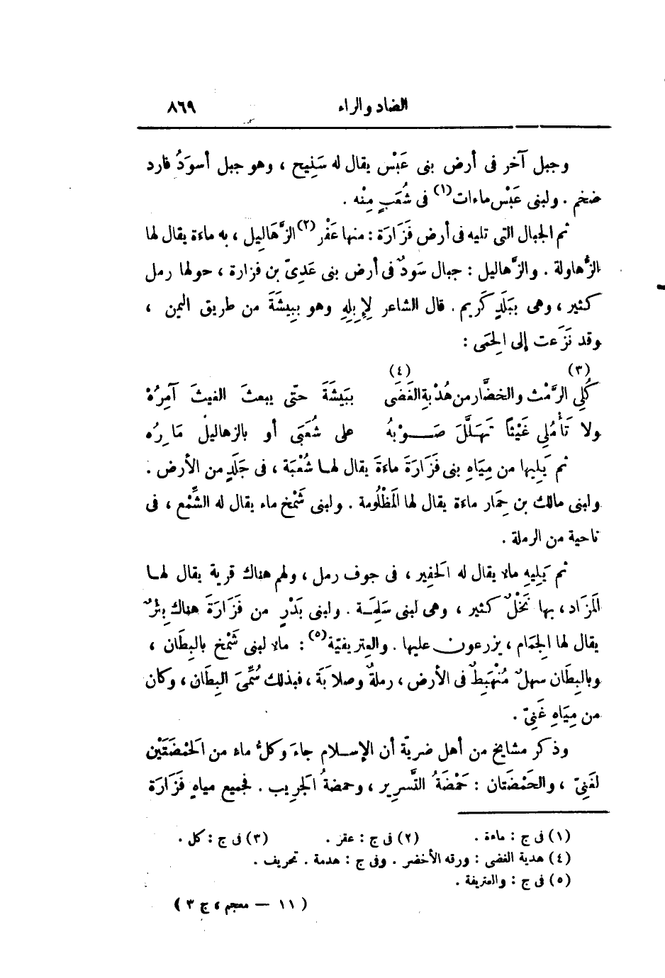 ثم يليه ماء يقال له الحفير، فى جوف رمل، ولهم هناك قرية يقال لها المزاد، بها نخل كثير، وهى لبنى سلمة. ولبنى بدر من فزارة هناك بئر يقال لها الجمام، يزرعون عليها. والعتريفيّة «5» : ماء لبنى شمخ بالبطان، وبالبطان سهل منهبط فى الأرض، رملة وصلابة، فبذلك سمّى البطان، وكان من مياه غنىّ.