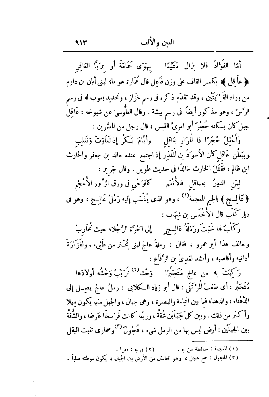 متجبّر: أى صعب المرتقى: قال أبو زياد الكلابى: رمل عالج يصل إلى الدّهناء، والدهناء فيما بين اليمامة والبصرة، وهى جبال، والجبل منها يكون ميلا وأكثر من ذلك. وبين كلّ جبلين شقّة، وربّما كانت فرسخا عرضا، والشّقّة بين الجبلين: أرض ليس بها من الرمل شىء، هجول «3» وصحارى تنبت البقل