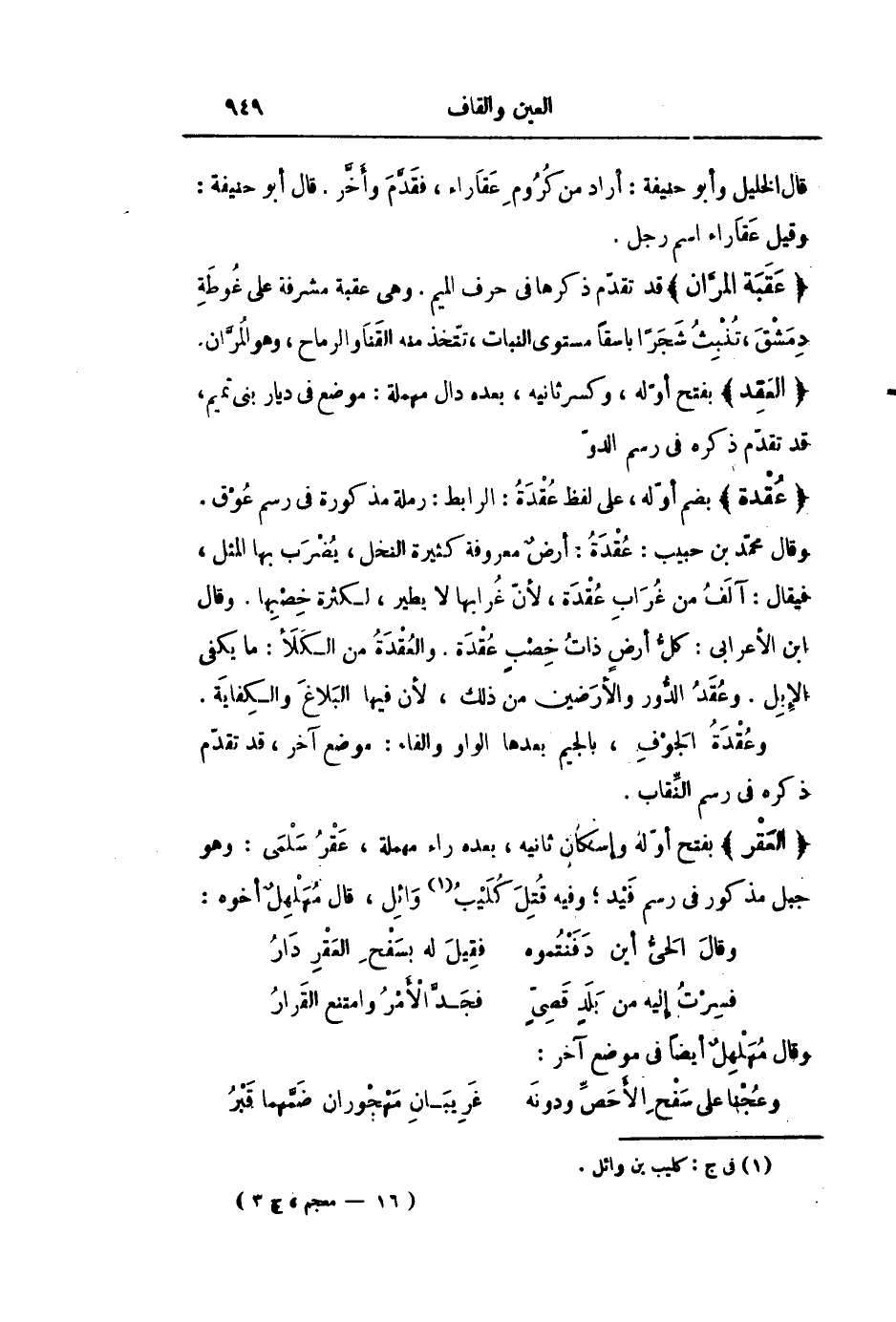 وقال محمّد بن حبيب: عقدة: أرض معروفة كثيرة النخل، يضرب بها المثل، فيقال: آلف من غراب عقدة، لأنّ غرابها لا يطير، لكثرة خصبها. وقال ابن الأعرابى: كلّ أرض ذات خصب عقدة. والعقدة من الكلأ: ما يكفى الإبل. وعقد الدّور والأرضين من ذلك، لأن فيها البلاغ والكفاية.