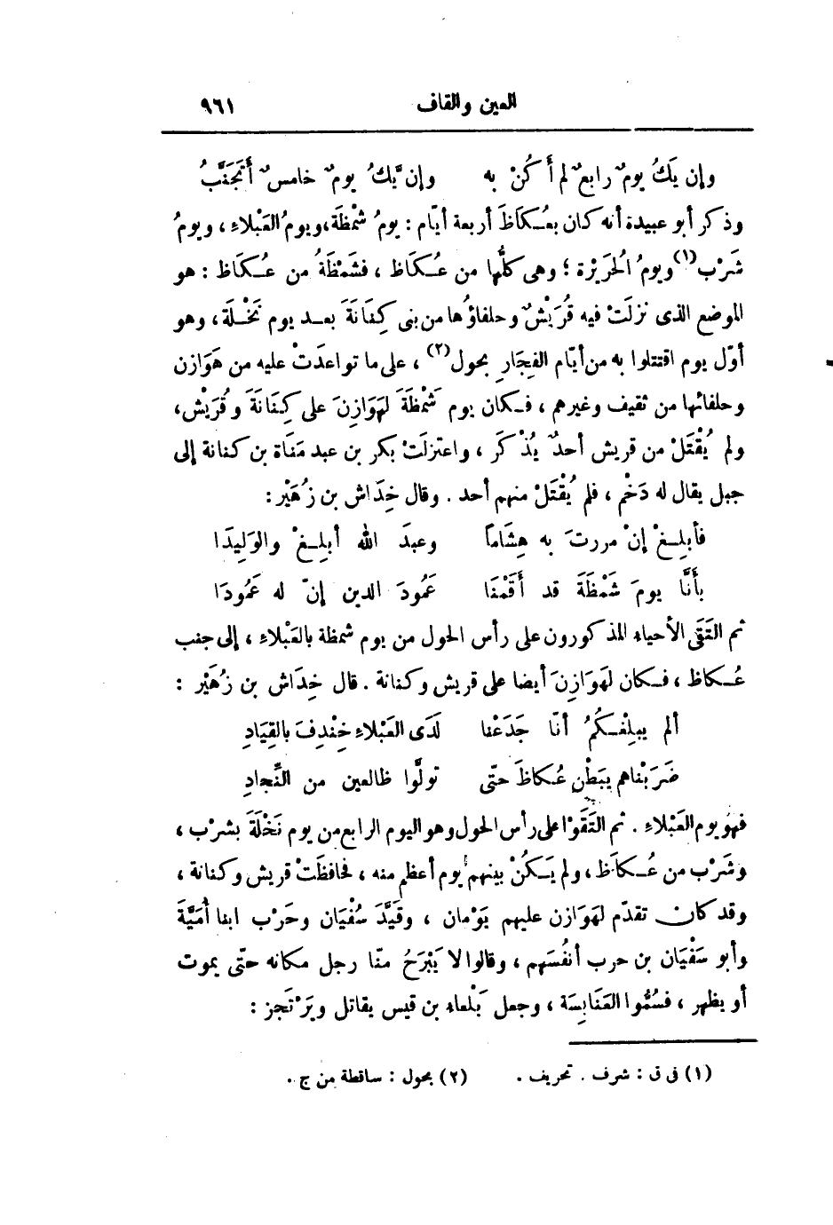 وذكر أبو عبيدة أنه كان بعكاظ أربعة أيّام: يوم شمظة، ويوم العبلاء، ويوم شرب «1» ويوم الحريرة؛ وهى كلّها من عكاظ، فشمظة من عكاظ: هو الموضع الذي نزلت فيه قريش وحلفاؤها من بنى كنانة بعد يوم نخلة، وهو أوّل يوم اقتتلوا به من أيّام الفجار بحول «2» ، على ما تواعدت عليه من هوازن وحلفائها من ثقيف وغيرهم، فكان يوم شمظة لهوازن على كنانة وقريش، ولم يقتل من قريش أحد يذكر، واعتزلت بكر بن عبد مناة بن كنانة إلى جبل يقال له دخم، فلم يقتل منهم أحد. وقال خداش بن زهير: