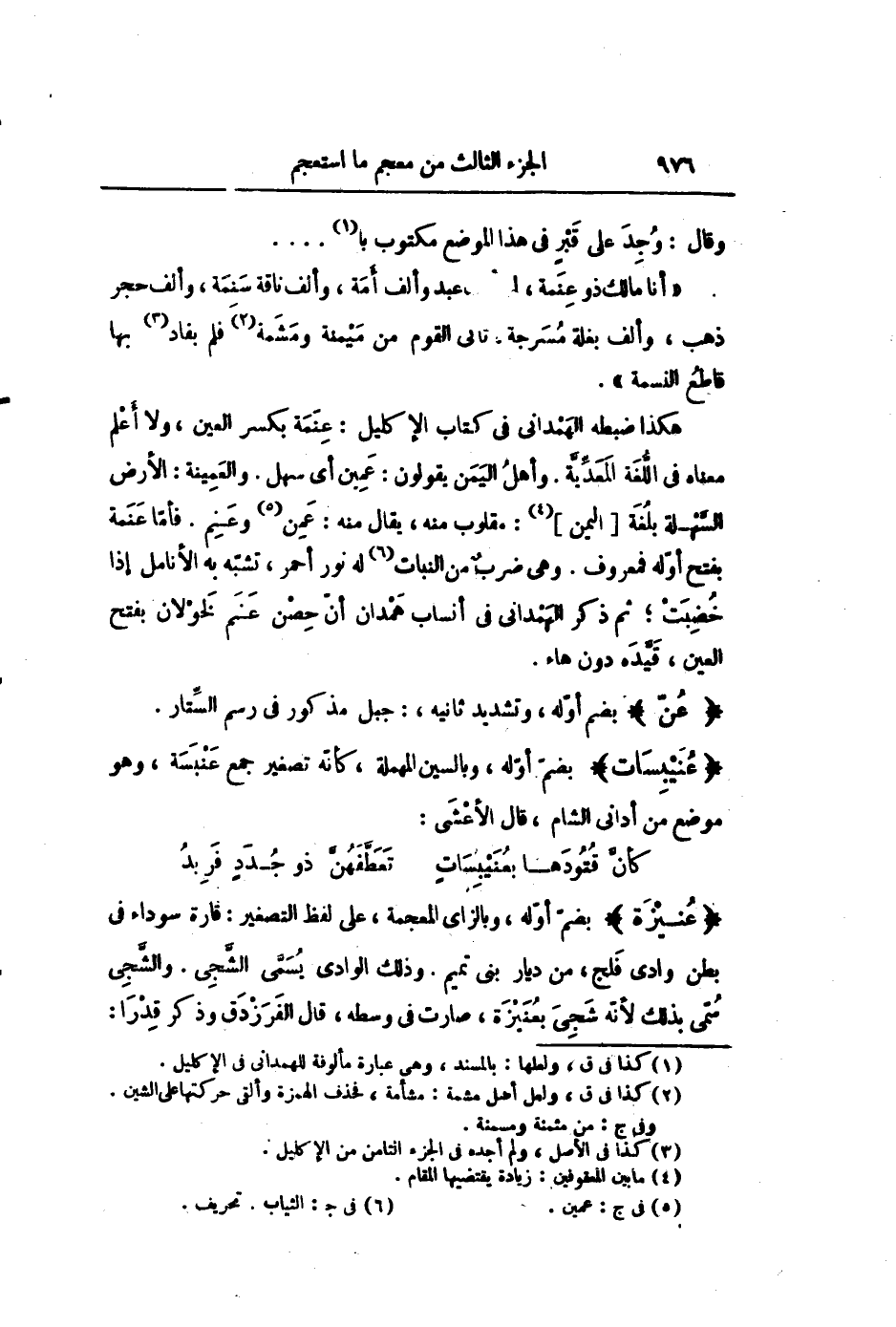 هكذا ضبطه الهمدانى فى كتاب الإكليل: عنمة بكسر العين، ولا أعلم معناه فى اللّغة المعدّيّة. وأهل اليمن يقولون: عمين أى سهل. والعمينة: الأرض السّهلة بلغة [اليمن] «4» : مقلوب منه، يقال منه: عمن «5» وعنم. فأمّا عنمة بفتح أوّله فمعروف. وهى ضرب من النبات «6» له نور أحمر، تشبّه به الأنامل إذا خضبت؛ ثم ذكر الهمدانى فى أنساب همدان أنّ حصن عنم لخولان بفتح العين، قيّده دون هاء.