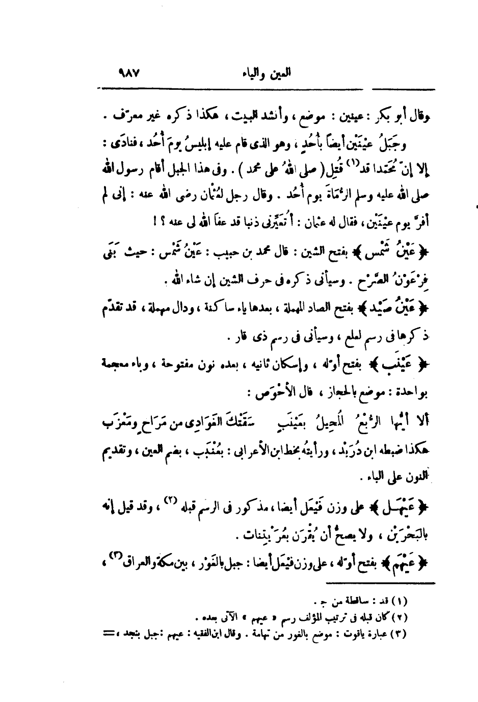 إلا إنّ محمّدا قد «1» قتل (صلى الله على محمد) . وفى هذا الجبل أقام رسول الله صلى الله عليه وسلم الرّماة يوم أحد. وقال رجل لعثمان رضى الله عنه: إنى لم أفرّ يوم عينين، فقال له عثمان: أتعيّرنى ذنبا قد عفا الله لى عنه؟!