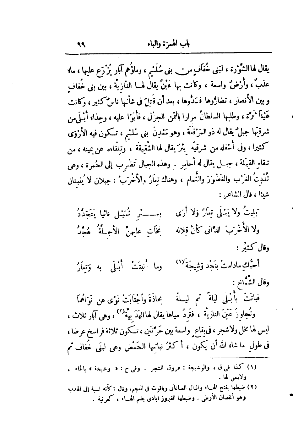 وتجاوز عين النازيّة، فترد مياها يقال لها الهدبيّة «2» ، وهى آبار ثلاث، ليس لها نخل ولا شجر، فى بقاع واسعة بين حرّتين، تكون ثلاثة فراسخ عرضا، فى طول ما شاء الله أن يكون، أكثر نباتها الحمض وهى لبنى خفاف ثم