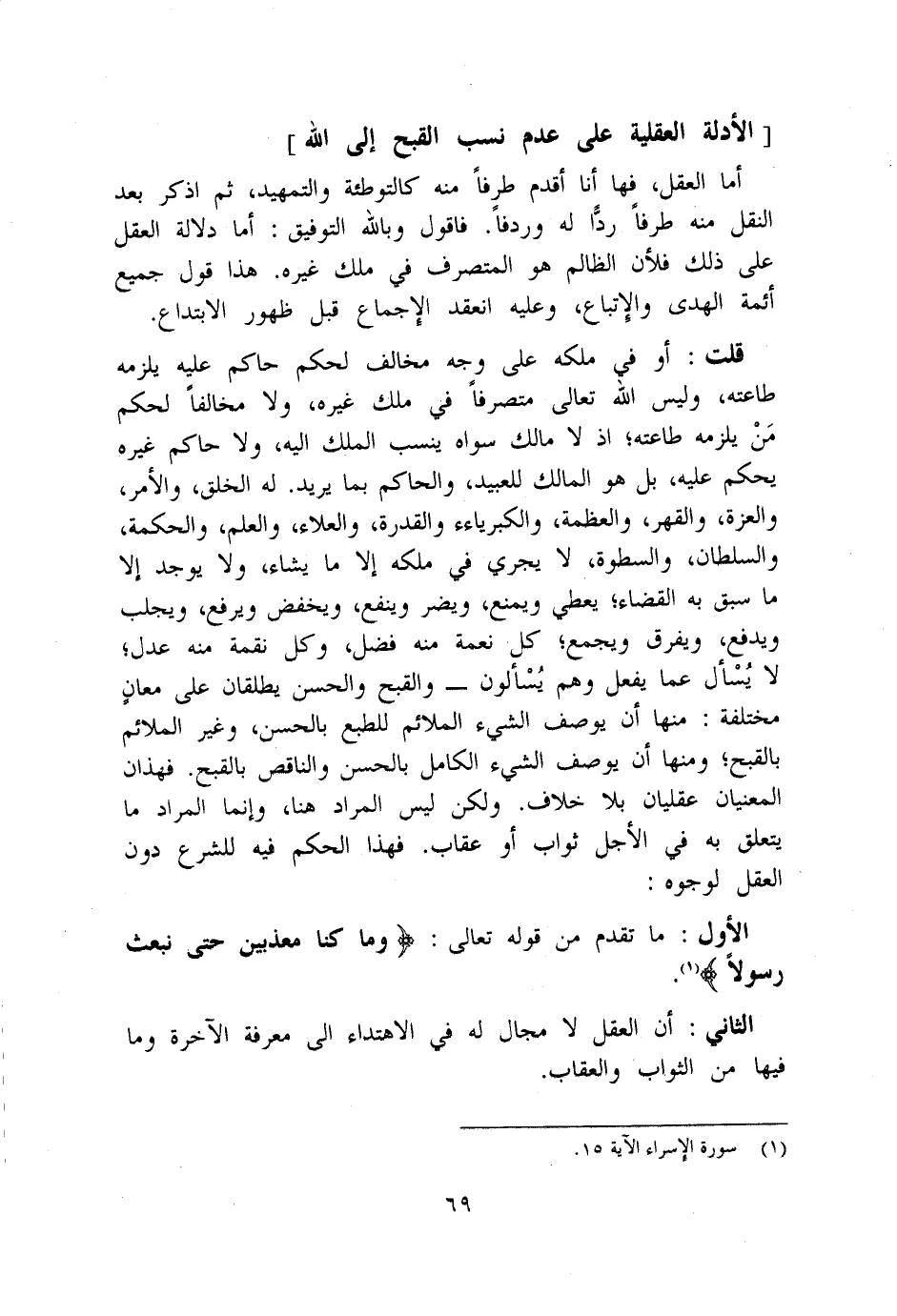 فهذان المعنيان عقليان بِلَا خلاف وَلَكِن لَيْسَ المُرَاد هُنَا وَإِنَّمَا المُرَاد مَا يتَعَلَّق بِهِ فِي الْأَجَل ثَوَاب أَو عِقَاب فَهَذَا الحكم فِيهِ للشَّرْع دون الْعقل لوجوه الأول مَا تقدم من قَوْله تَعَالَى {وَمَا كُنَّا معذبين حَتَّى نبعث رَسُولا}