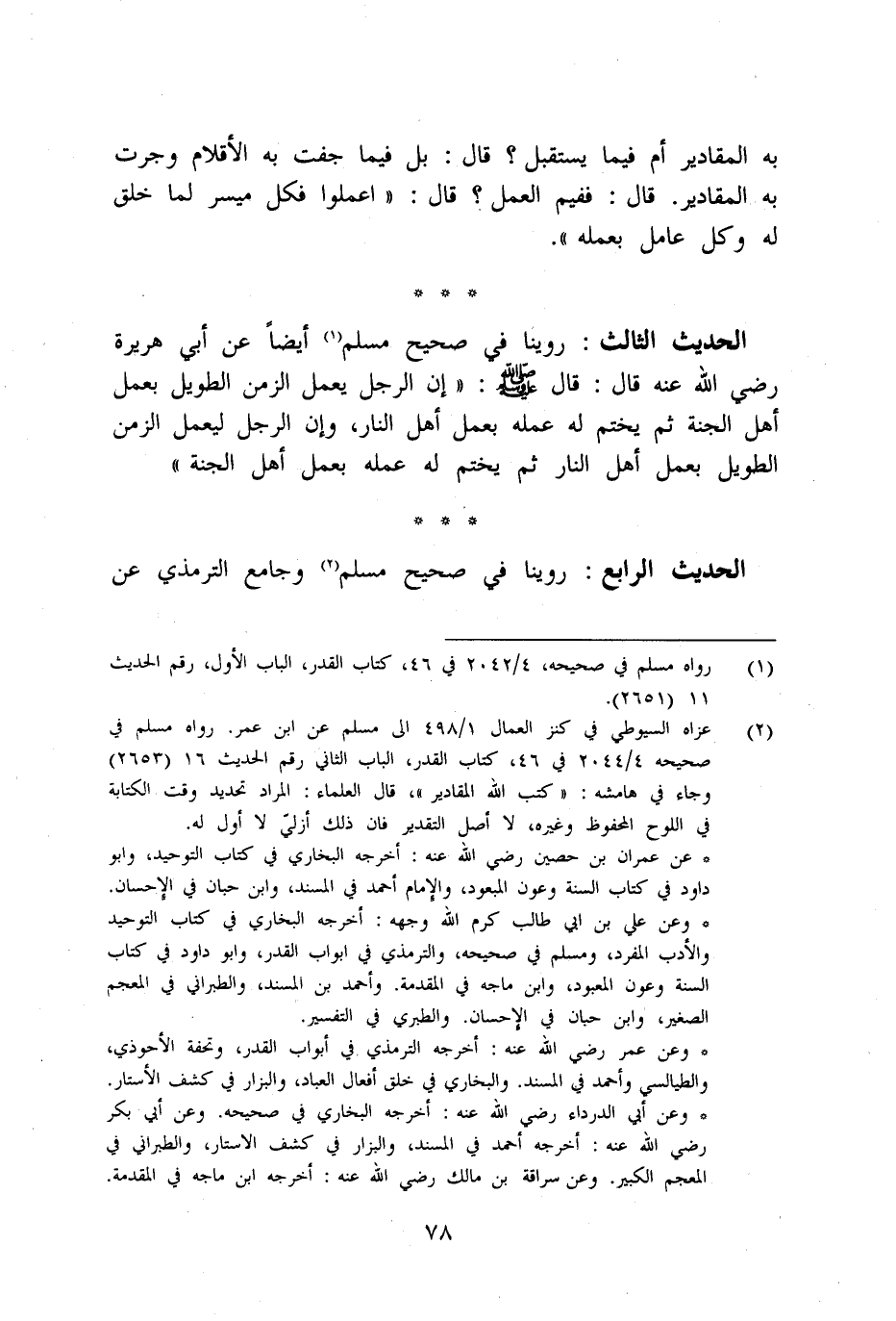 الحَدِيث الثَّالِث روينَا فِي صَحِيح مُسلم أَيْضا عَن أبي هُرَيْرَة رَضِي الله عَنهُ قَالَ قَالَ صلى الله عَلَيْهِ وَسلم (إِن الرجل يعْمل الزَّمن الطَّوِيل بِعَمَل أهل الْجنَّة ثمَّ يخْتم لَهُ عمله بِعَمَل أهل النَّار وَإِن الرجل ليعْمَل الزَّمن الطَّوِيل بِعَمَل أهل النَّار ثمَّ يخْتم لَهُ عمله بِعَمَل أهل الْجنَّة)