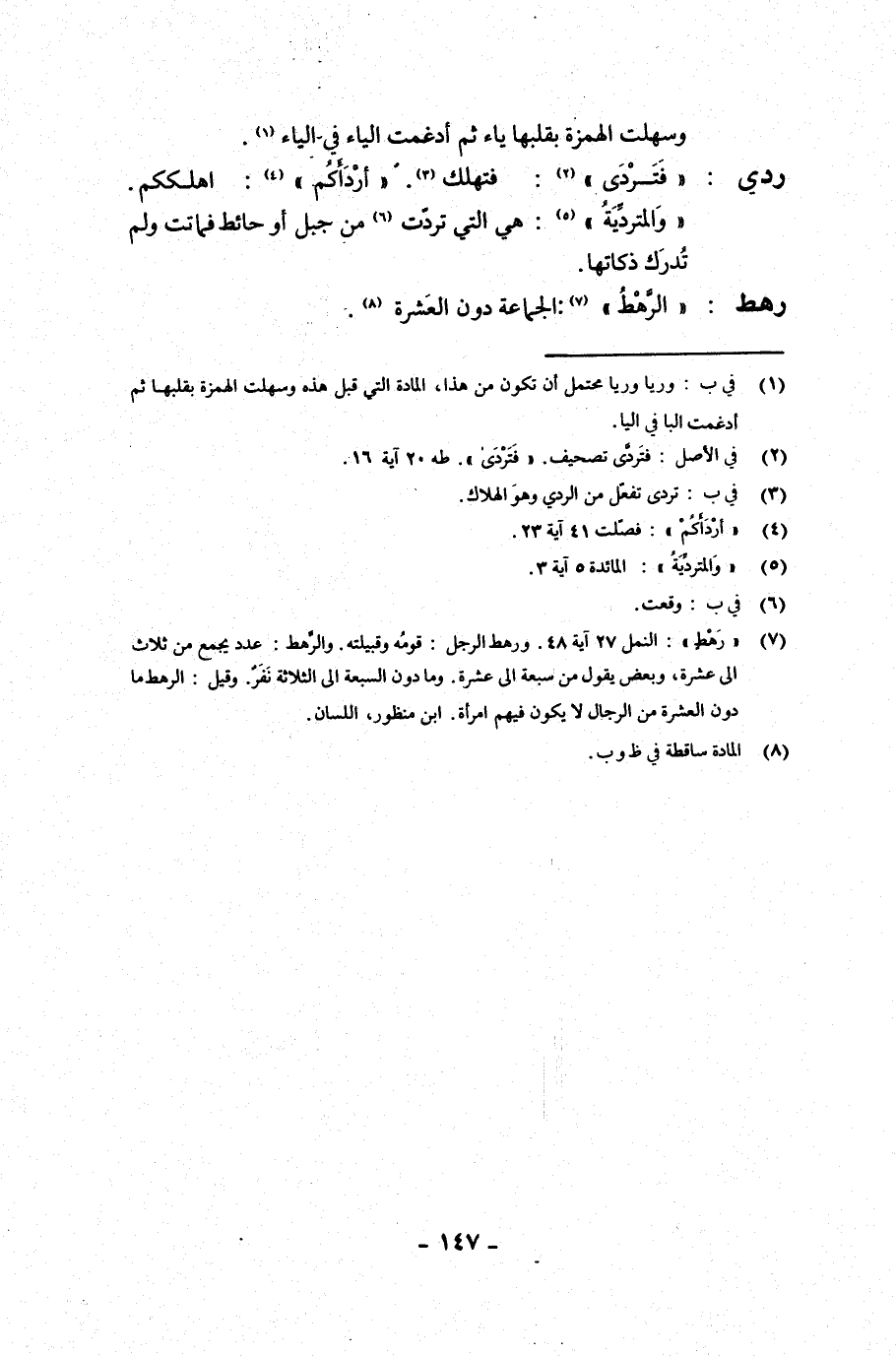ردي: {فتردى}: فتهلك. {أرداكم}: أهلككم. {والمتردية}: هي التي تردت من جبل أو حائط فماتت ولم تدرك ذكاتها.