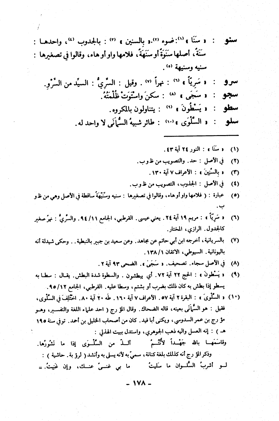 سنو: {سنا}: ضوء. {بالسنين}: بالجدوب، واحدها سنة، أصلها سنوة أو سنهة، فلامها واو أو هاء، وقالوا في تصغيرها سنية وسنيهة.