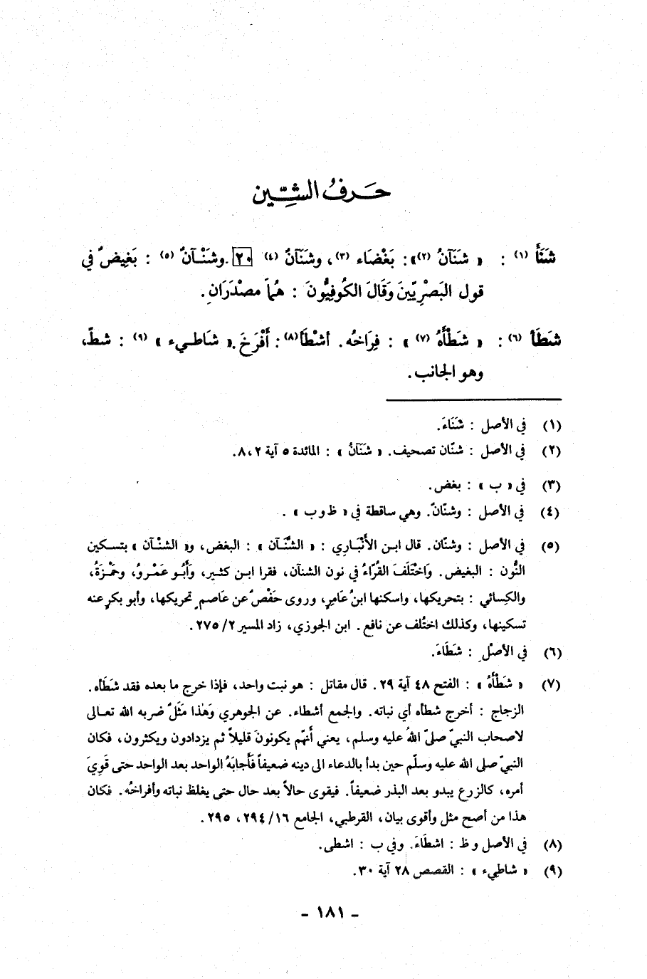 شنأ: {شنآن}: بغضاء، وشنآن. وشنآن: بغيض في قول البصريين وقال الكوفيون: هما مصدران.