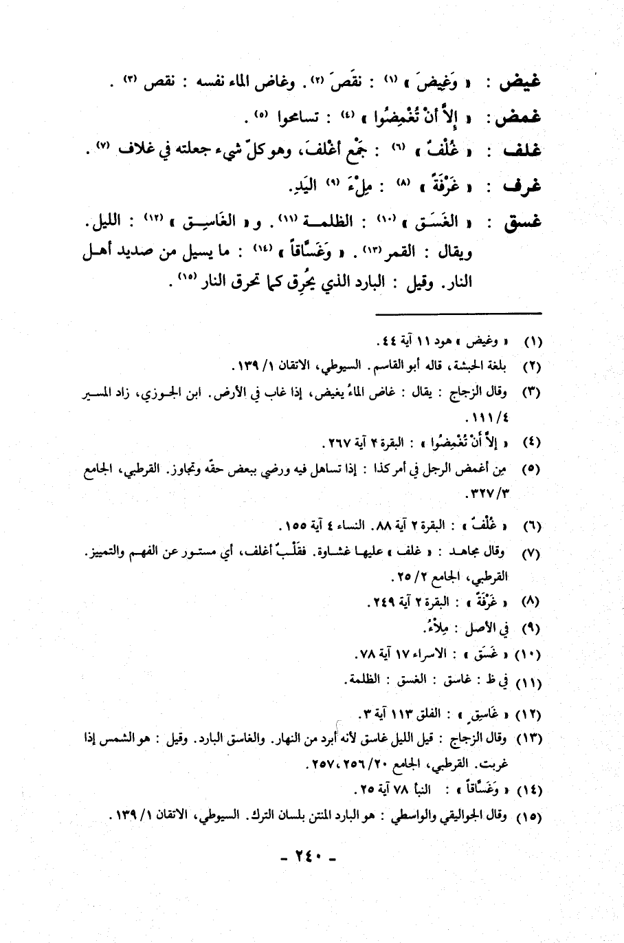 غسق: {الغسق}: الظلمة. و {الغاسق}: الليل. ويقال: القمر. و {غساقا}: ما يسيل من صديد أهل النار. وقيل: البارد الذي يحرق كما تحرق النار.