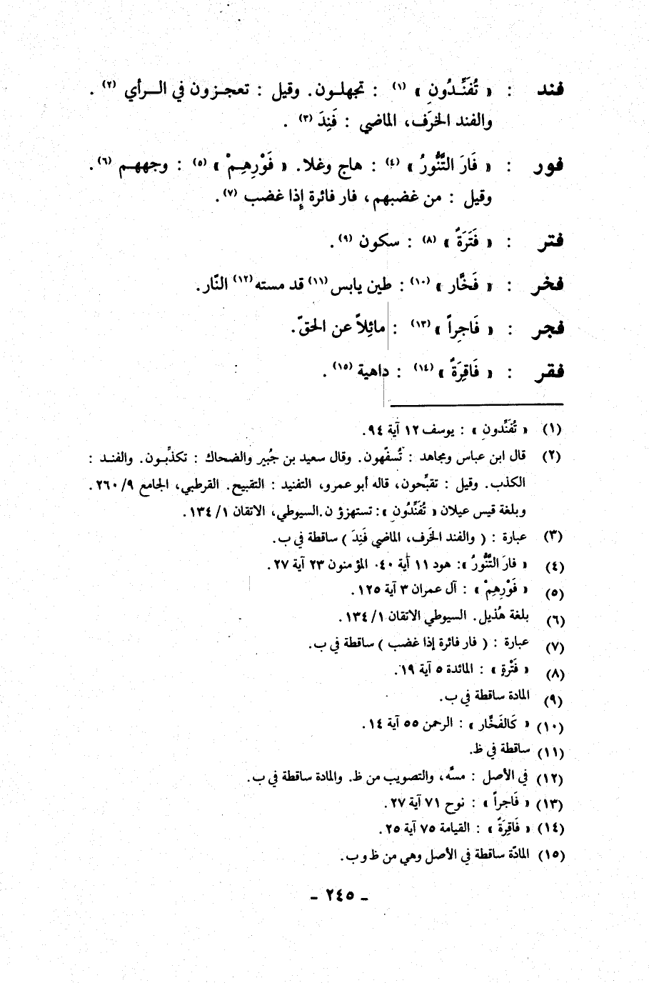 فند: {تفندون}: تجهلون. وقيل: تعجزون في الرأي والفند الخرف، الماضي: فنِدَ.