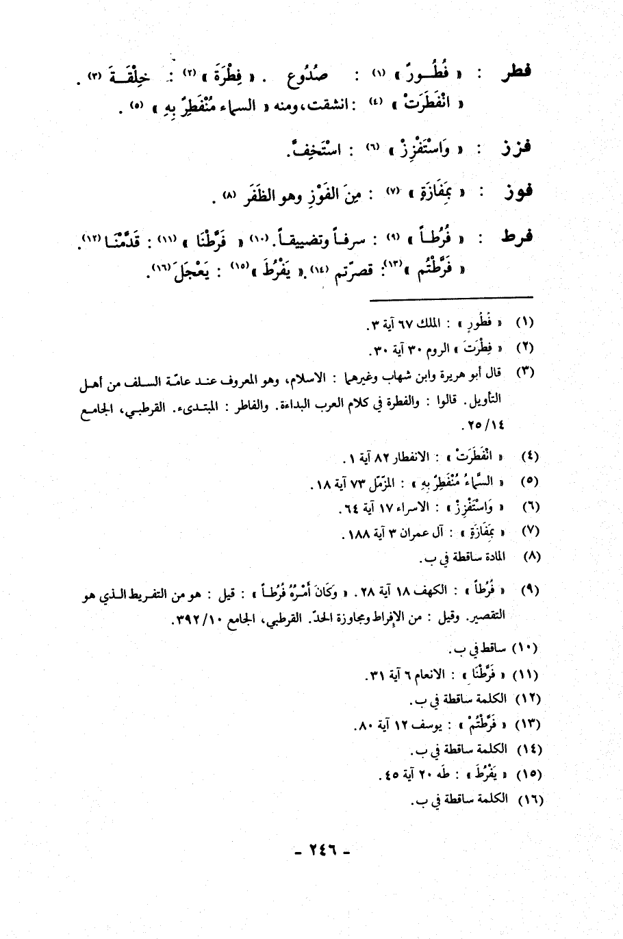 فرط: {فرطا}: سرفا وتضييقا. {فرطنا}: قدمنا. {فرطتم}: قصرتم. {يفرط}: يعجل.
