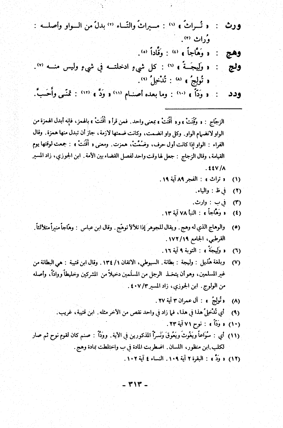 ورث: {تراث}: ميراث والتاء بدل من الواو وأصله وُراث.