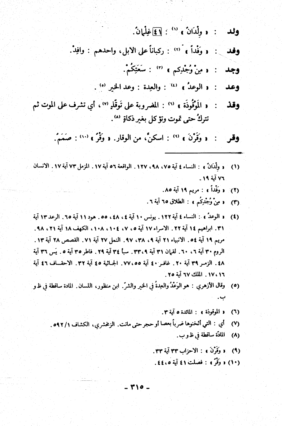 وقذ: {الموقوذة}: المضروبة على توقذ، أي تشرف على الموت ثم تترك حتى تموت وتؤكل بغير ذكاة.