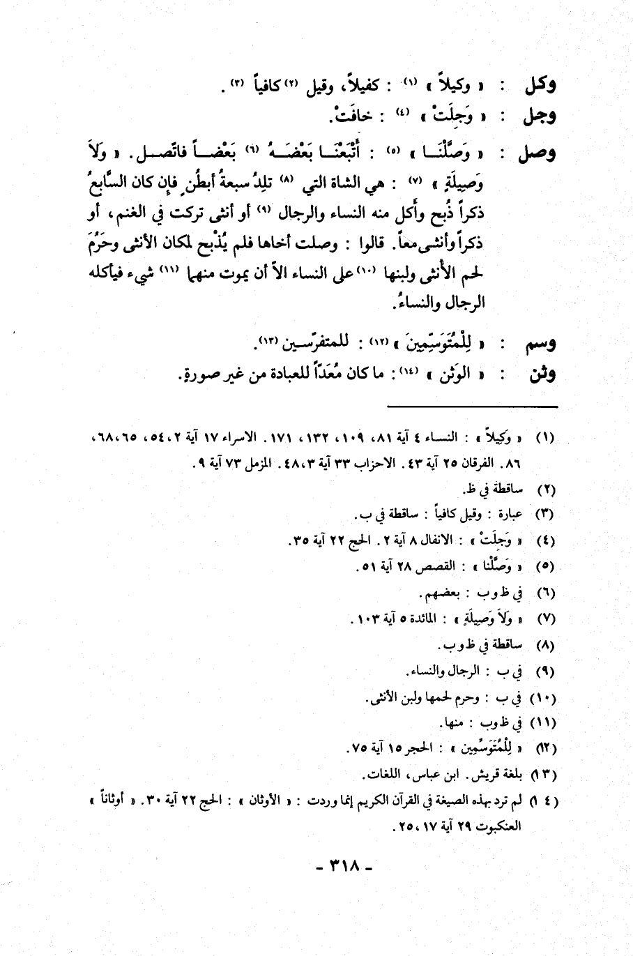 وصل: {وصلنا}: أتبعنا بعضه بعضا فاتصل. {ولا وصيلة}: هي الشاة التي تلد سبعة أبطن فإن كان السابع ذكرا ذبح وأكل منه النساء والرجال أو أنثى تركت في الغنم، أو ذكرا وأنثى معا. قالوا: وصلت أخاها فلم يذبح لمكان الأنثى وحرم لحم الأنثى ولبنها على النساء إلا أن يموت منهما شيء فيأكله الرجال والنساء.
