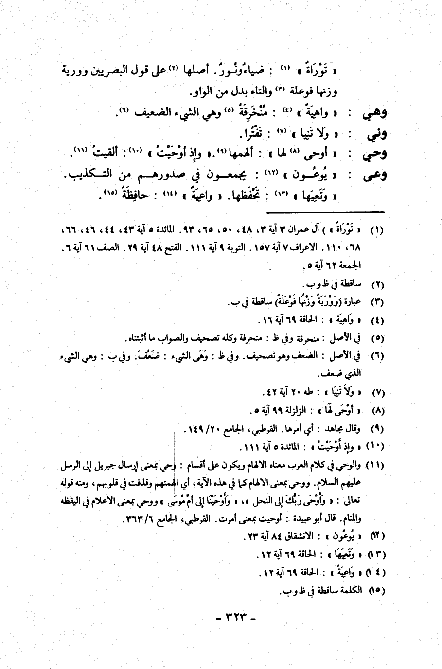 {توراة}: ضياء ونور. أصلها على قول البصريين وورية وزنها فوعلة والتاء بدل من الواو.