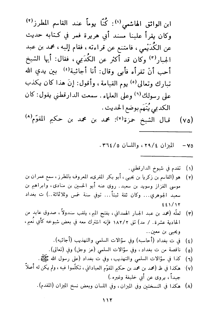 75 - قال الشيخ حمزة محمد بن محمد بن حكيم المقوم العباداني تكلمة فيه ولم أر له أصلا جيدا يروي عن أبي خليفة وغيره سمعت محمد بن محمد بن حيكم يقول سمعت بشران بن موسى الرامهرامزي يقول سمعت بندار يقول من طلب الأغراب في الحديث لم ينبل