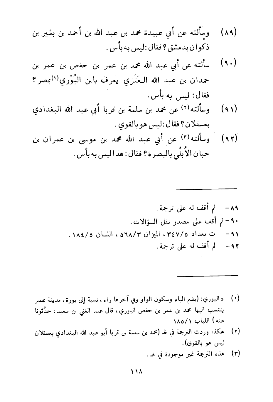 92 - وسألته عن أبي عبد الله محمد بن موسى بن عمران بن حبان الأبلي بالبصرة فقال هذا ليس به بأس