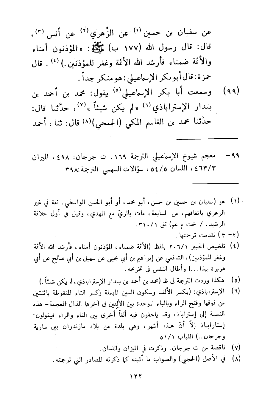 99 - وسمعت أبا بكر الإسماعيلي يقول محمد بن أحمد بن بندار الأستراباذي لم يكن شيئا حدثنا قال حدثنا محمد بن القاسم المكي الجمحي قال ثنا أحمد بن أبي بزة نا المؤمل بن إسماعيل نا حماد بن سلمة عن سهيل عن أبيه عن أبي هريرة قال قضى رسول الله صلى الله عليه وسلم باليمين مع الشاهد