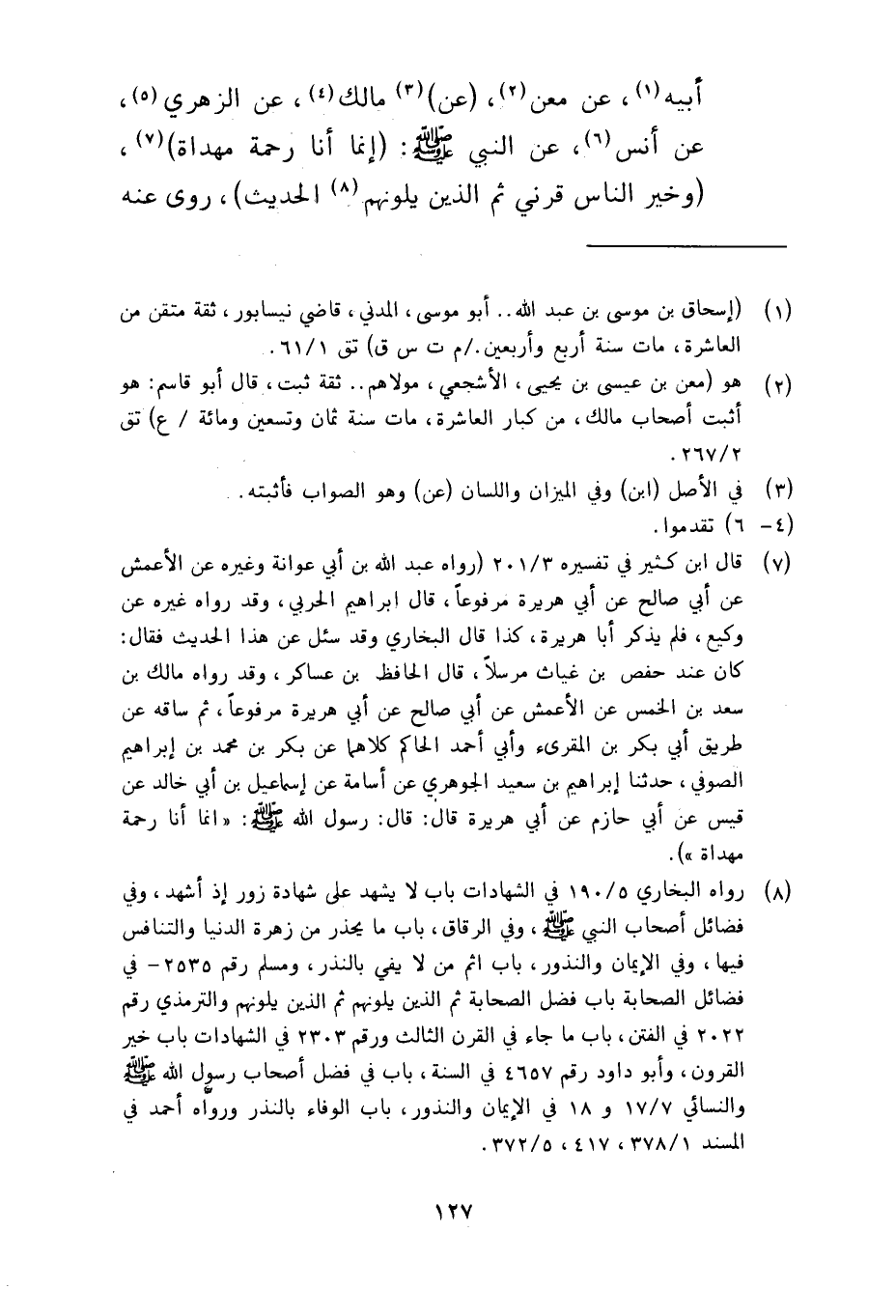 أبيه عن معن عن مالك عن الزهري عن أنس عن النبي صلى الله عليه وسلم إنما أنا رحمة مهداة وخير الناس قرني ثم الذين يلونهم الحديث روى عنه