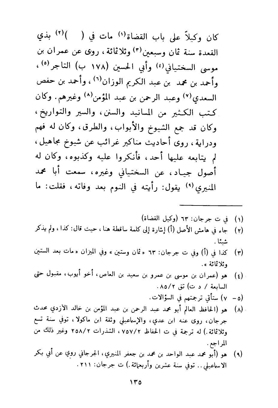 كان وكيلا على باب القضاة مات في بذي القعدة سنة ثمان وسبعين وثلاثمائة روى عن عمران بن موسى السختياني وأبي الحسين التاجر وأحمد بن محمد بن عبد الكريم الوزان وأحمد بن حفص السعدي وعبد الرحمن بن عبد المؤمن وغيرهم وكان كتب الكثير من المسانيد والسنن والسير والتواريخ وكان قد جمع الشيوخ والأبواب والطرق وكان له فهم ودراية روى أحاديث مناكير غرائب عن شيوخ مجاهيل لم يتابعه عليها أحد فأنكروا عليه وكذبوه وكان له أصول جياد عن السختياني وغيره سمعت أبا محمد المنيري يقول رأيته في النوم بعد وفاته فقلت ما