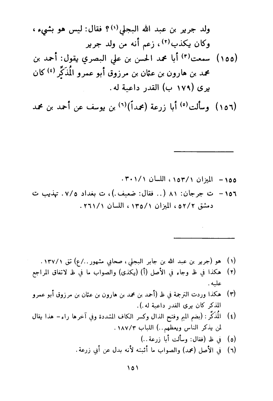 155 - سمعت أبا محمد الحسن بن علي البصري يقول أحمد بن محمد بن هارون بن عثمان بن مروزق أبو عمرو المذكر كان يرى القدر داعية له
