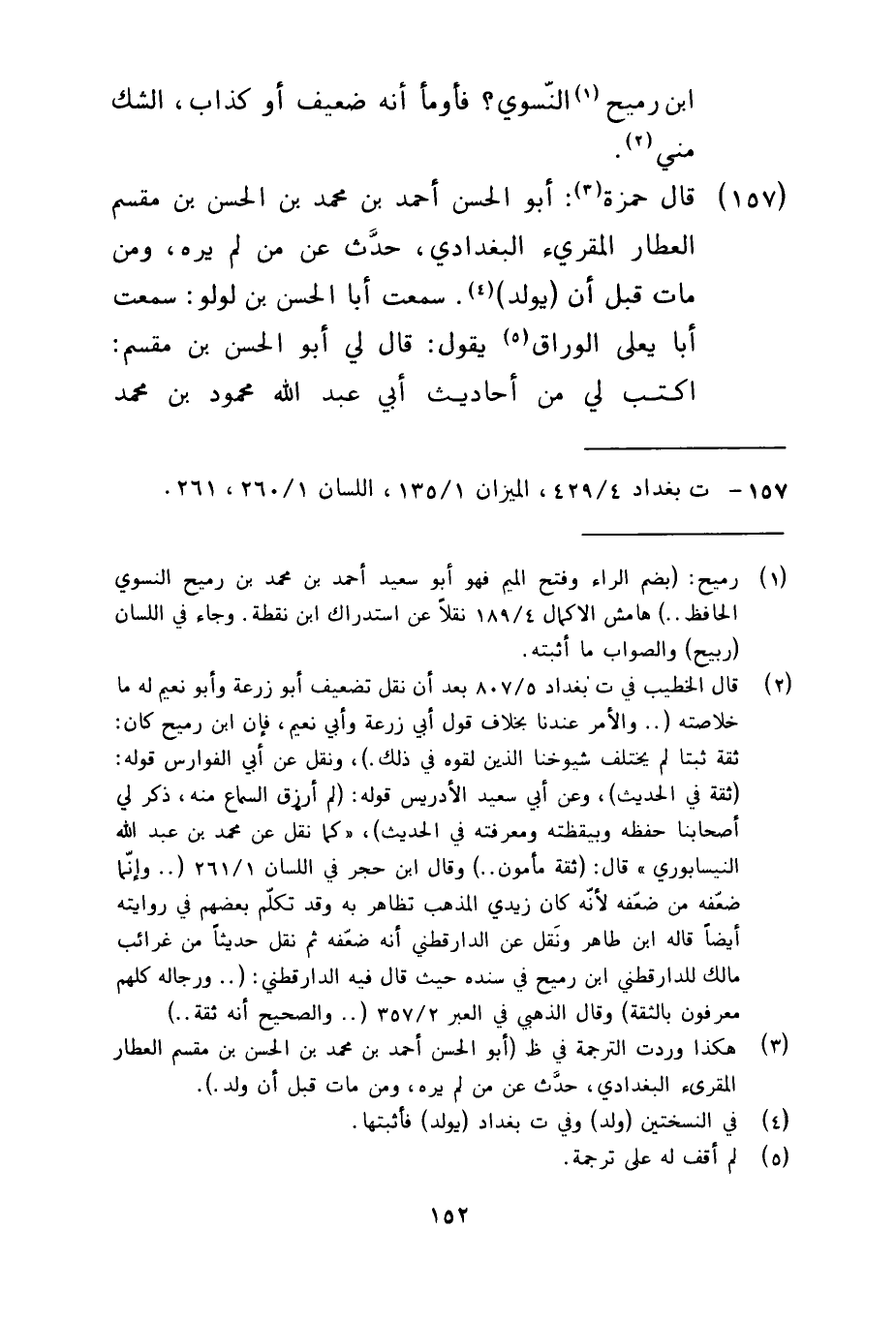 157 - قال حمزة أبو الحسن أحمد بن محمد بن الحسن بن مقسم العطار المقرئ البغدادي حدث عن من لم يره ومن مات قبل أن يولد سمعت أبا الحسن بن لولو سمعت أبا يعلى الوراق يقول قال لي أبو الحسن بن مقسم اكتب لي من أحاديث أبي عبد الله محمود بن محمد الواسطي قال فقلت له متى سمعت منه قال وما كتبت له شيئا وسمعت الدارقطني وجماعة من المشايخ تكلموا في بن مقسم وكان أمره أبين من هذا