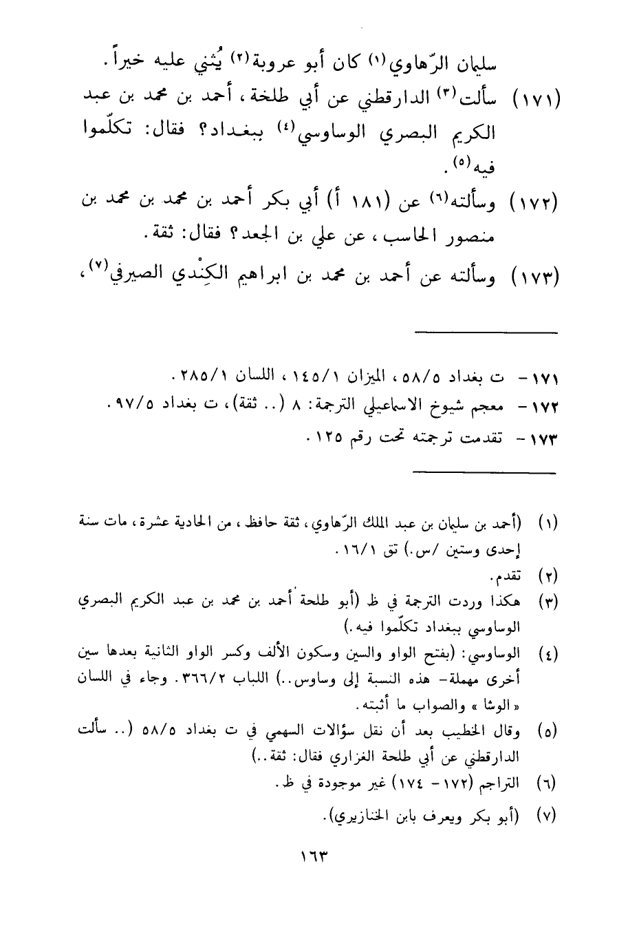 171 - سألت الدارقطني عن أبي طلحة أحمد بن محمد بن عبد الكريم البصري الوساوسي ببغداد فقال تكلموا فيه