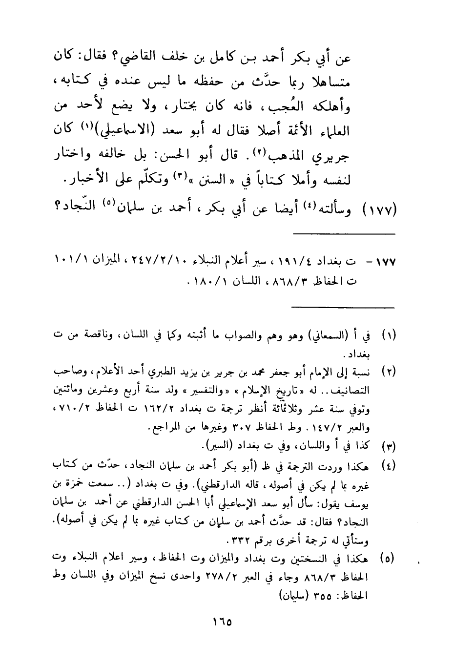 177 - وسألته أيضا عن أبي بكر أحمد بن سلمان النجاد فقال الشيخ أبو الحسن قد حدث أحمد بن سلمان من كتاب غيره بما لم يكن في أصوله
