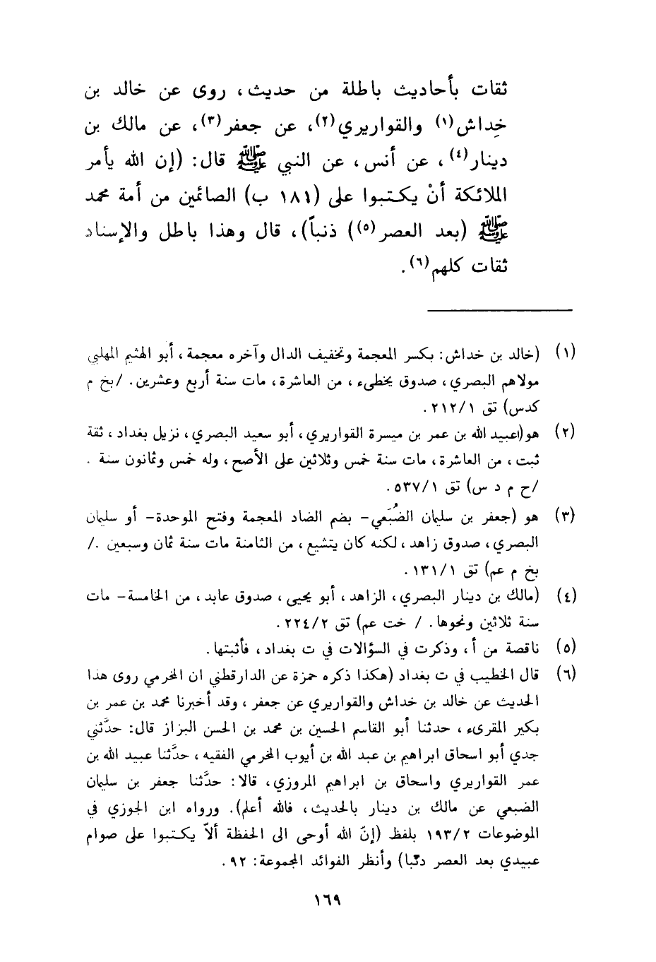 ثقات بأحاديث باطلة من حديث روى عن خالد بن خداش والقواريري عن جعفر عن مالك بن دينار عن أنس عن النبي صلى الله عليه وسلم قال إن الله يأمر الملائكة أن يكتبوا على الصائمين من أمة محمد صلى الله عليه وسلم بعد العصر ذنبا قال وهذا باطل الإسناد ثقات كلهم