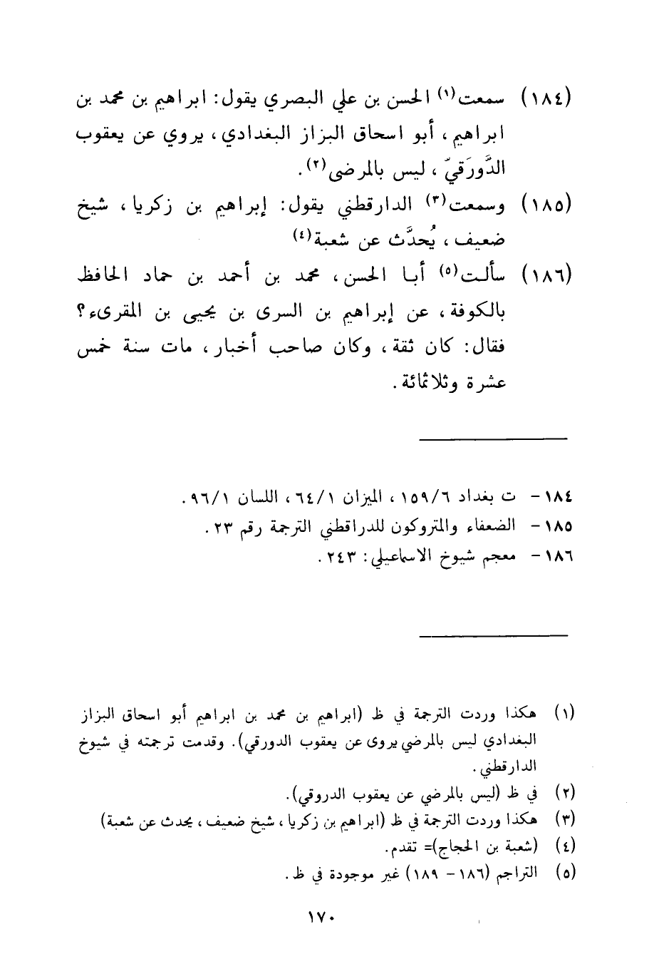 184 - سمعت الحسن بن علي البصري يقول إبراهيم بن محمد بن إبراهيم أبو إسحاق البزاز البغدادي يروي عن يعقوب الدورقي ليس بالمرضى