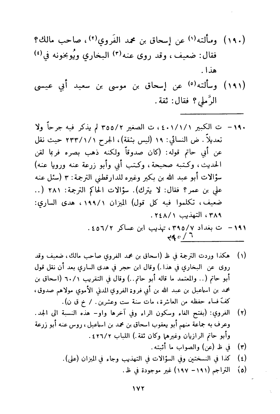 190 - وسألته عن إسحاق بن محمد الفروي صاحب مالك فقال ضعيف وقد روى عنه البخاري ويوبخونه في هذا