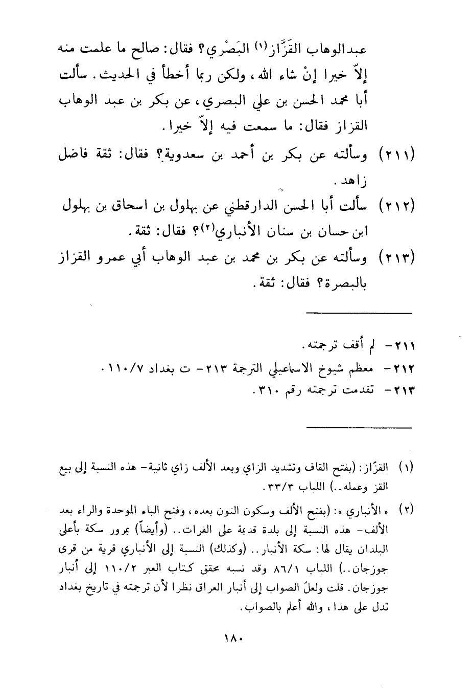 212 - سألت أبا الحسن الدارقطني عن بهلول بن إسحاق بن بهلول بن حسان بن سنان الأنباري فقال ثقة