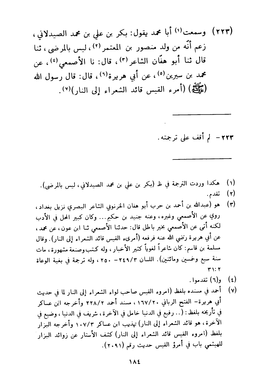 223 - وسمعت أبا محمد يقول بكر بن علي بن محمد الصيدلاني زعم أنه من ولد منصور بن المعتمر ليس بالمرضي ثنا قال ثنا أبو هفان الشاعر قال نا الأصمعي عن محمد بن سيرين عن أبي هريرة قال قال رسول الله صلى الله عليه وسلم أمرىء القيس قائد الشعراء إلى النار