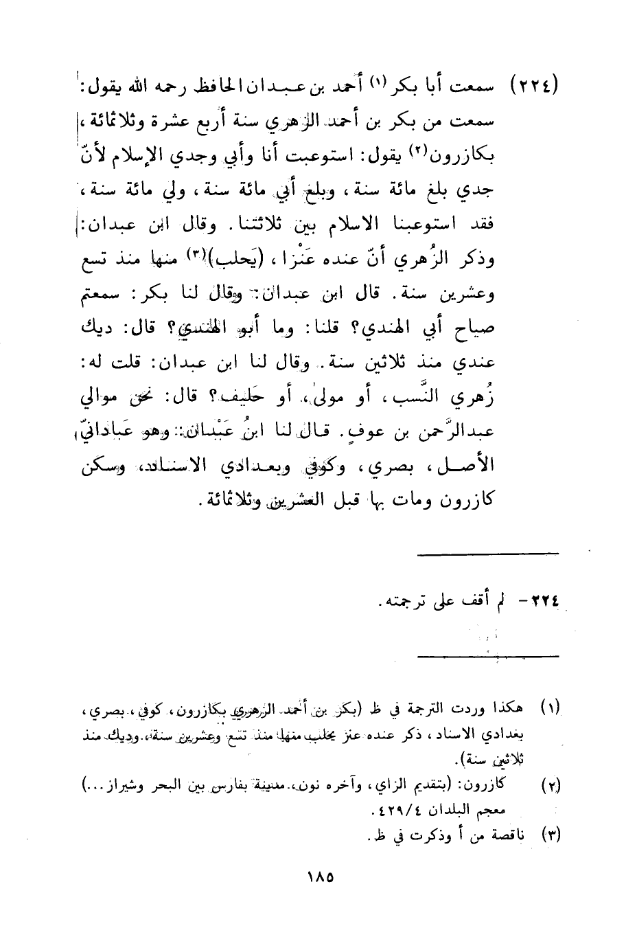 224 - سمعت أبا بكر أحمد بن عبدان الحافظ رحمه الله يقول سمعت من بكر بن أحمد الزهري سنة أربع عشرة وثلاثمائة بكازرون يقول استوعبت أنا وأبي وجدي الإسلام لأن جدي بلغ مائة سنة وبلغ أبي مائة سنة ولي مائة سنة فقد استوعبنا الإسلام بين ثلاثتنا وقال بن عبدان وذكر الزهري أن عنده عنزا يحلب منها منذ تسع وعشرين سنة قال بن عبدان وقال لنا بكر سمعتم صياح أبي الهندي قلنا وما أبو الهندي قال ديك عندي منذ ثلاثين سنة وقال لنا بن عبدان قلت له زهري النسب أو مولى أو حليف قال نحن موالي عبد الرحمن بن عوف قال لنا بن عبدان وهو عباداني الأصل بصري وكوفي وبغدادي الإسناد وسكن كازرون ومات بها قبل العشرين وثلاثمائة