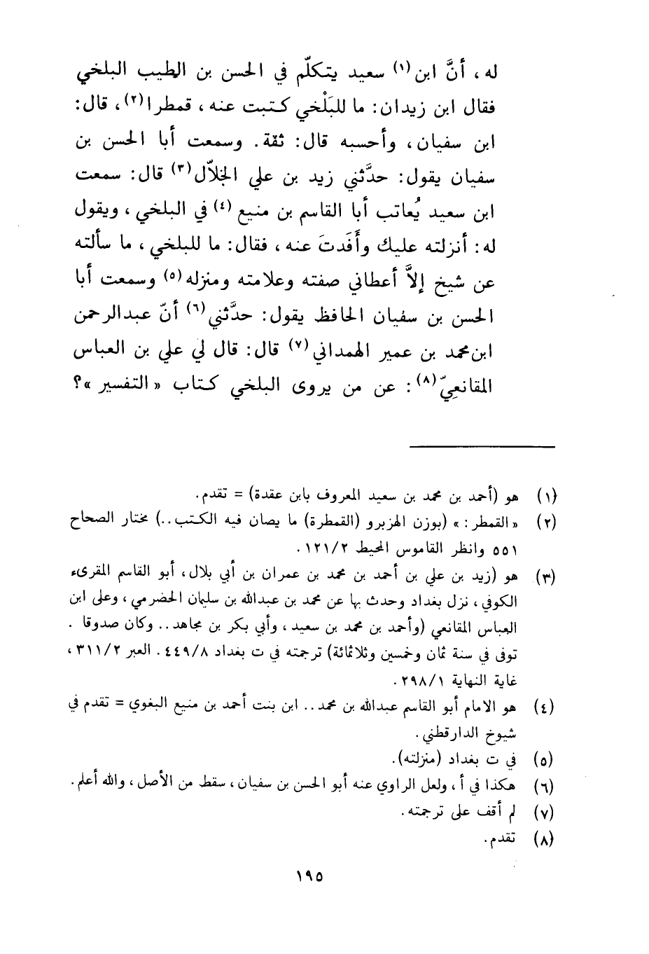 له أن بن سعيد يتكلم في الحسن بن الطيب البلخي فقال بن زيدان ما للبلخي كتبت عنه قمطرا قال بن سفيان وأحسبه قال ثقة وسمعت أبا الحسن بن سفيان يقول حدثني زيد بن علي الخلال قال سمعت بن سعيد يعاتب أبا القاسم بن منيع في البلخي ويقول له أنزلته عليك وأفدت عنه فقال ما للبلخي ما سألته عن شيخ إلا أعطاني صفته وعلامته ومنزله وسمعت أبا الحسن بن سفيان الحافظ يقول حدثني أن عبد الرحمن بن محمد بن عمير الهمداني قال قال لي علي بن العباس المقانعي عن من يروى البلخي كتاب التفسير