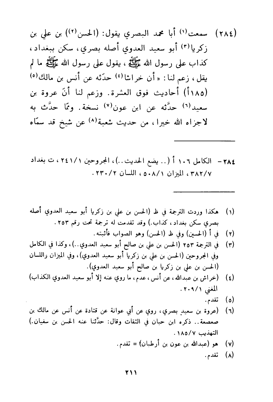 284 - سمعت أبا محمد البصري يقول الحسن بن علي بن زكريا أبو سعيد العدوي أصله بصري سكن ببغداد كذاب على رسول الله صلى الله عليه وسلم يقول على رسول الله صلى الله عليه وسلم ما لم يقل زعم لنا أن خراشا حدثه عن أنس بن مالك أحاديث فوق العشرة وزعم لنا أن عروة بن سعيد حدثه عن بن عون نسخة ومما حدث به لاجزاه الله خيرا من حديث شعبة عن شيخ قد سماه لنا عن شعبة عن توبة العنبري عن أنس رفعه إلى النبي صلى الله عليه وسلم عليكم بالوجوه الملاح والحدق السود فإن الله يستحي أن يعذب وجها مليحا بالنار وبأشياء كثيرة تبين كذبه على رسول الله صلى الله عليه وسلم