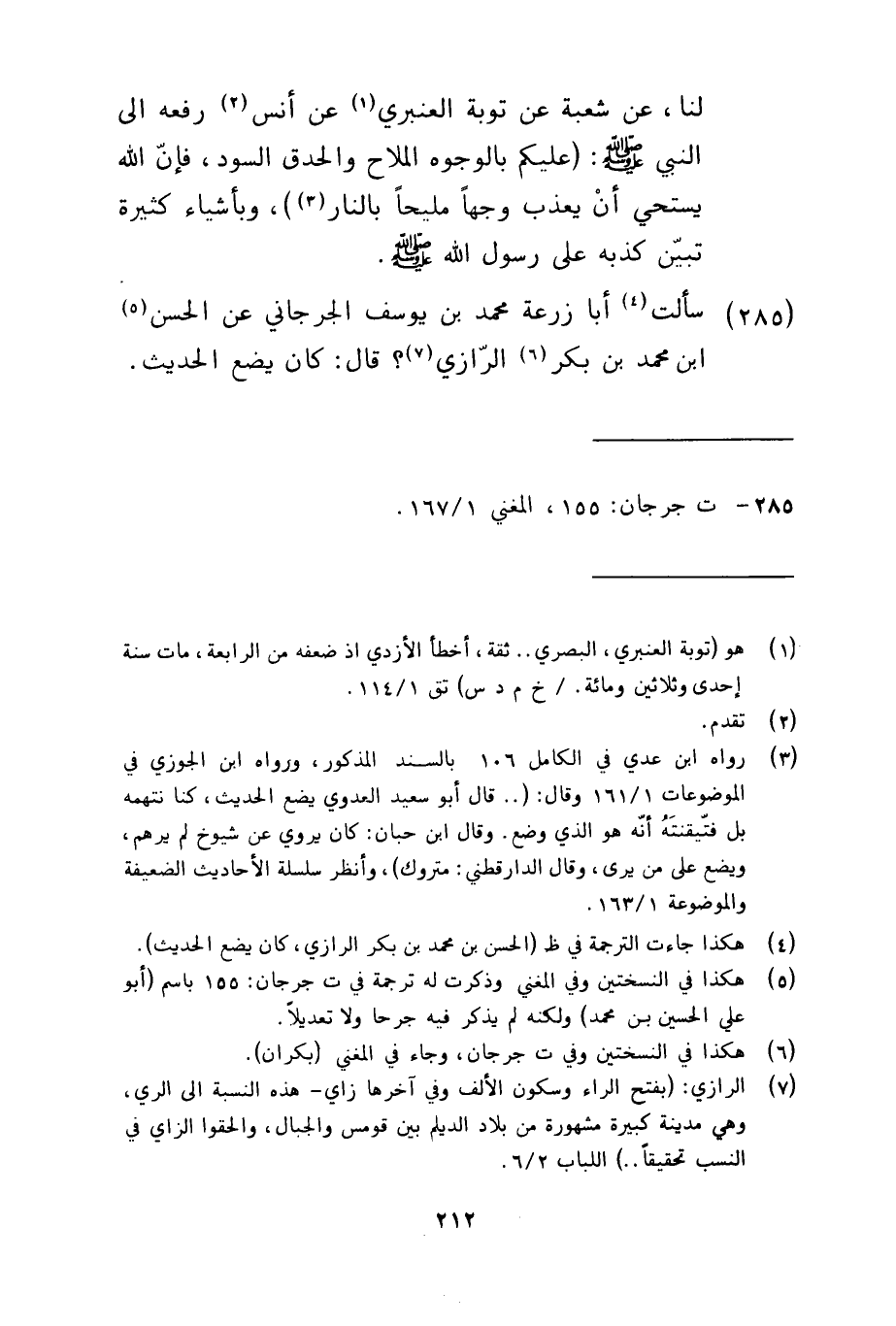 285 - سألت أبا زرعة محمد بن يوسف الجرجاني عن الحسن بن محمد بن بكر الرازي قال كان يضع الحديث
