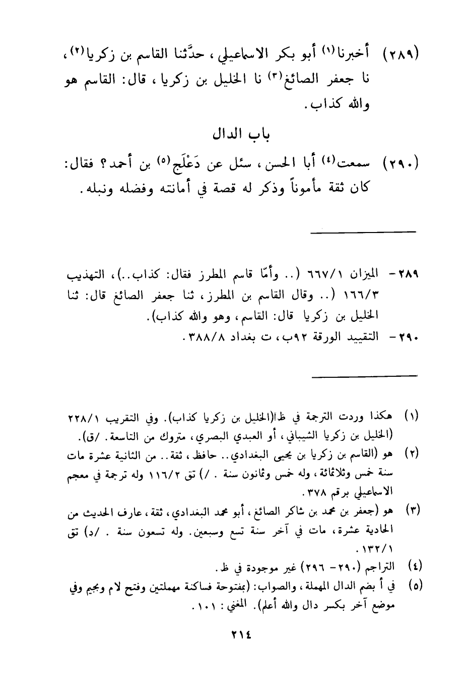 289 - أخبرنا أبو بكر الإسماعيلي حدثنا القاسم بن زكريا نا جعفر الصائغ نا الخليل بن زكريا قال القاسم هو والله كذاب