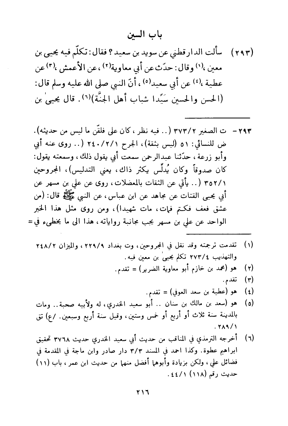 293 - سألت الدارقطني عن سويد بن سعيد فقال تكلم فيه يحيى بن معين وقال حدث عن أبي معاوية عن الأعمش عن عطية عن أبي سعيد أن النبي صلى الله عليه وسلم قال الحسن والحسين سيدا شباب أهل الجنة قال يحيى معين وهذا باطل عن أبي معاوية لم يروه غير سويد وجرح سويد لروايته لهذا الحديث قال الدارقطني رحمه الله فلم نزل نظن أن هذا كما قاله يحيى وأن سويدا أتى أمرا عظيما في روايته لهذا الحديث حتى دخلت مصر فس سنة سبع وخمسين فوجدت هذا الحديث في مسند أبي يعقوب إسحاق بن إبراهيم بن يونس البغدادي المعروف بالمنجنيقي وكان ثقة روى عن أبي كريب عن أبي معاوية كما قال سويد سواء وتخلص سويد وصح الحديث عن أبي معاوية وقد حدث أبو عبد الرحمن النسائي عن إسحاق بن إبراهيم هذا ومات أبو عبد الرحمن قبله