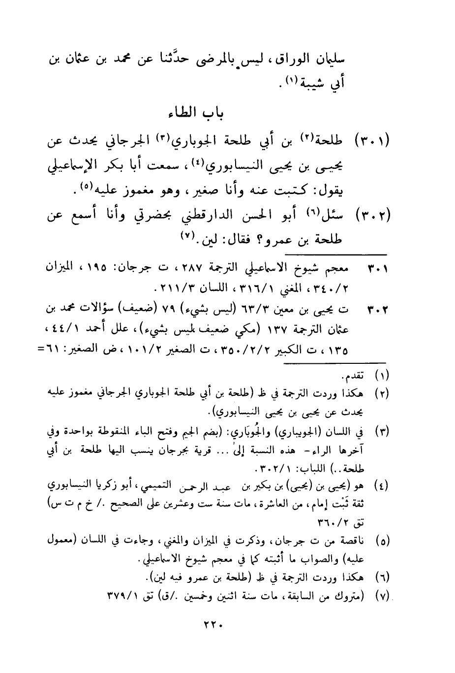 301 - طلحة بن أبي طلحة الجوباري الجرجاني يحدث عن يحيى بن يحيى النيسابوري سمعت أبا بكر الإسماعيلي يقول كتبت عنه وأنا صغير وهو مغموز عليه