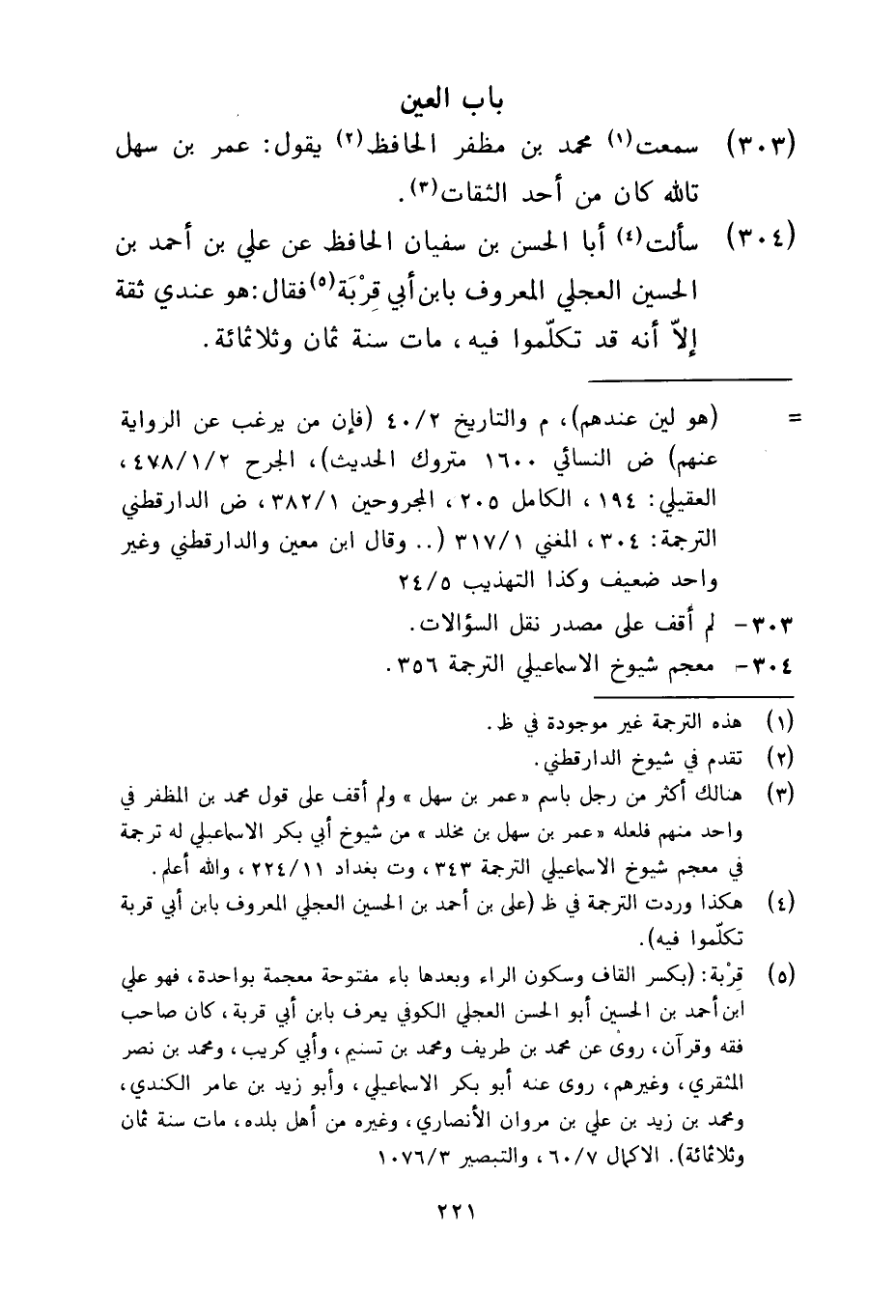 304 - سألت أبا الحسن بن سفيان الحافظ عن علي بن أحمد بن الحسين العجلي المعروف بابن أبي قربة فقال هو عندي ثقة إلا أنه قد تكلموا فيه مات سنة ثمان وثلاثمائة